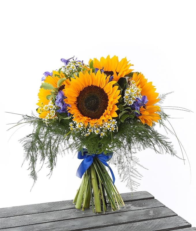 Vibrant sunflower, blue delphinium and tanacetum hand tied bouquet with a trailing fern and grass collar .’