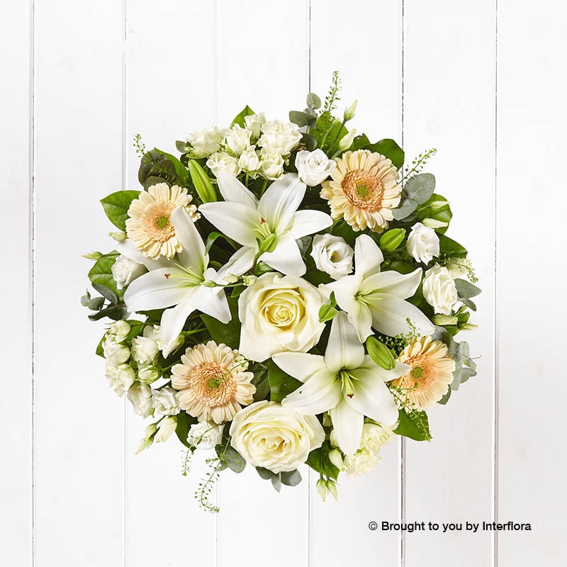Mellow Meringue New Baby Hand-tied features ivory large headed roses, white LA lilies, white lisianthus, white spray roses, cream germini and thlaspi, hand-tied with salal and eucalyptus. Our florists wrap the flowers in kraft paper and tie with ribbon, and Mellow Meringue New Baby Hand-tied is presented in Interflora Gift Box.