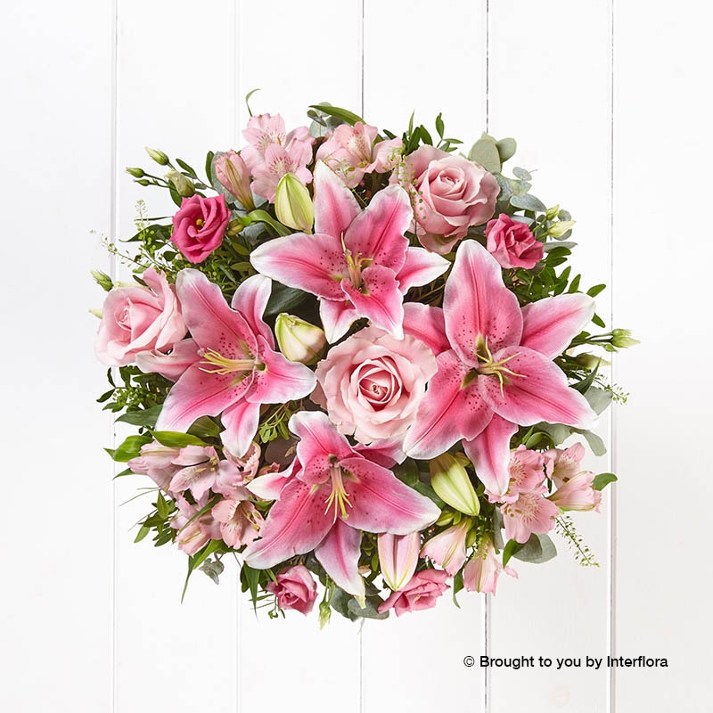 We use some of the most popular and stunning pink flowers – roses, lisianthus and lilies. We carefully source the finest stems to use to create Pink Delight New Baby Hand-tied and use green eucalyptus, thiaspi and pistache to compliment the vibrant pink tones of the flowers.