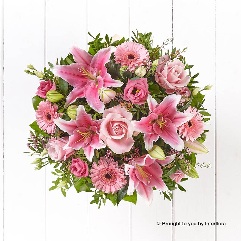 Bring out the pink tropical twist with our Pink Radiance hand-tied, designed by skilled florists. A beautiful selection of popular blooms in pinks and coral shades including lilies, roses germini, waxflower and lisianthus. Our flower team also add pistache and salal tips for green texture and volume.