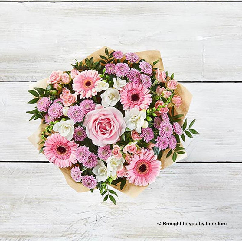 Our florists create Pink Sorbet with white freesia, pink germini, pale pink roses and chrysanthemum. Beautifully wrapped in kraft paper and presented in our Interflora gift box – the perfect floral gift to send someone special.