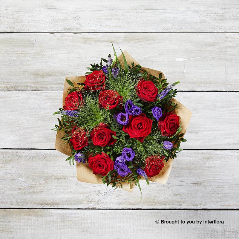 Our skilled florists use the finest ruby red roses, purple lisianthus for contrasting colour pop and luxury greenery for texture. Naomi roses are known for their rich red colour, large petal head and luxurious feel.