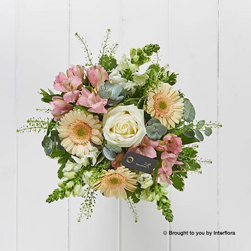 Carefully designed by expert florists, we use a fabulous mix of fresh flowers including pink alstroemeria, white antirrhinum, germini and ivory large headed rose. To create texture and summer garden feel, we add greenery thiaspi, eucalyptus and pittosporum.