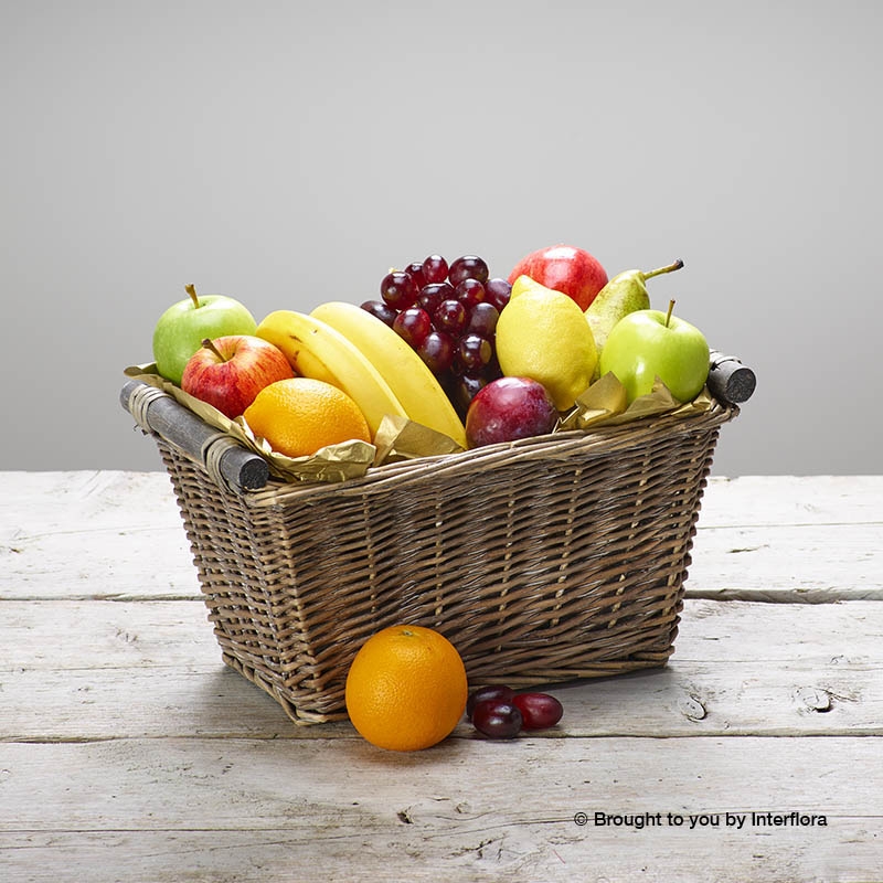 This generous selection of delicious fresh fruit is presented in an open willow basket. A classic gift for any occasion, this selection of fine fruits is sure to raise a smile. This gift set comes with Belgian Chocolates
