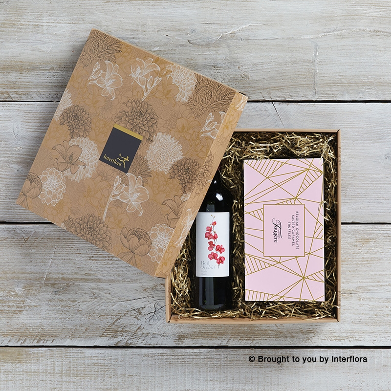 This lovely gift set combines a 75cl bottle of Red Orchid Merlot and a box of yummy Maison Fougère salted caramel chocolate truffles in a presentation box - to help them celebrate their special moment.