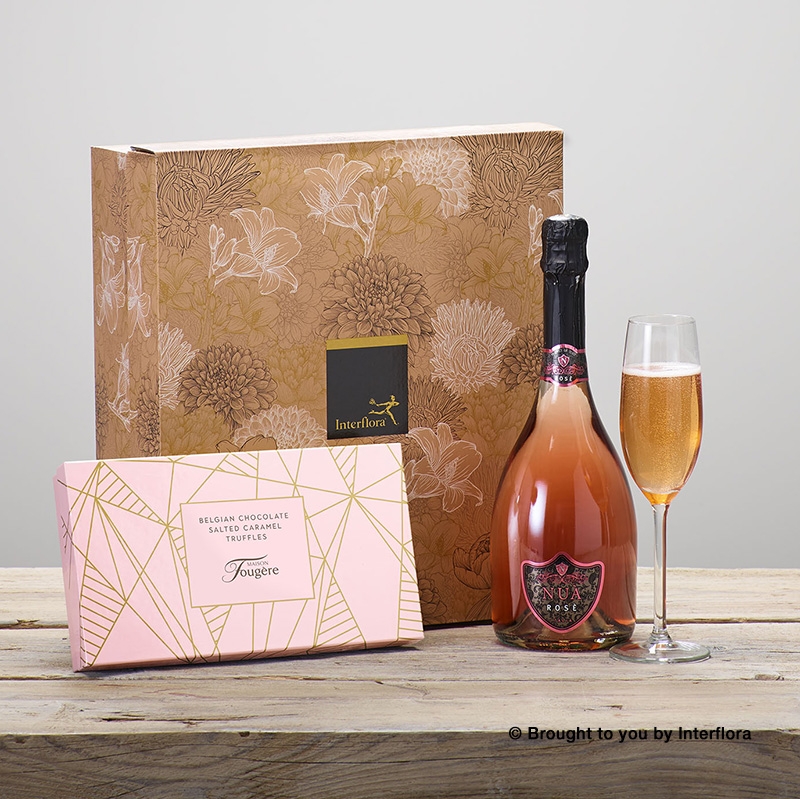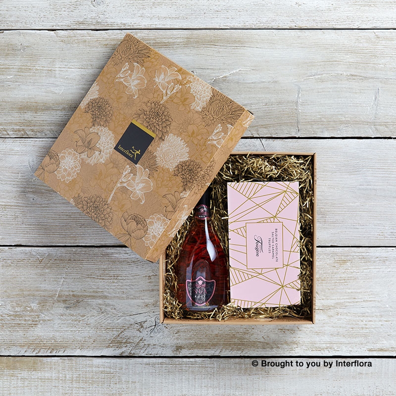 Celebrate the good times with this sweet treat - a 75cl bottle of sparkling Rosé, wine, and a box of delicious Maison Fougère chocolates in a presentation box.