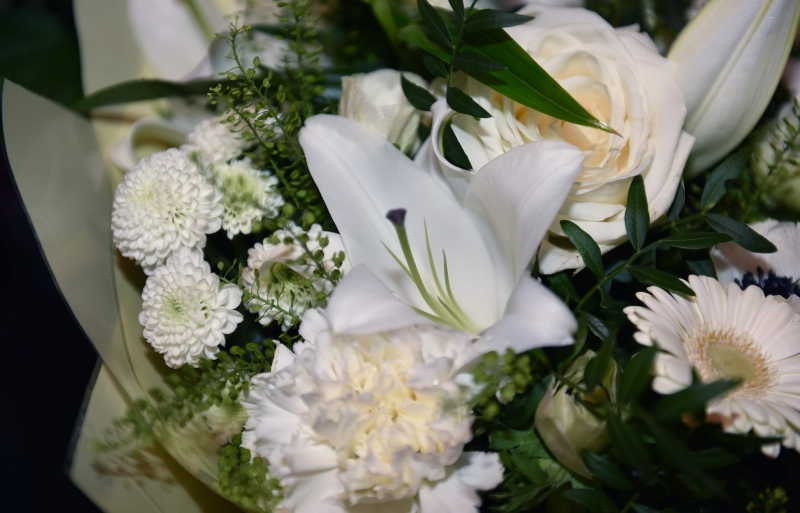 Beautiful oriental lilies are complemented by carnations, germini, santini, avalanche rose and green bell arranged perfectly in our perfectly white Rebeca bouquet