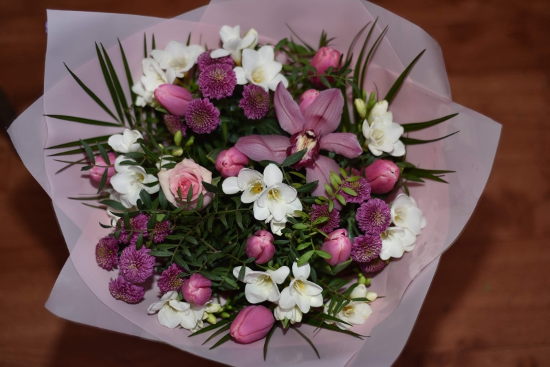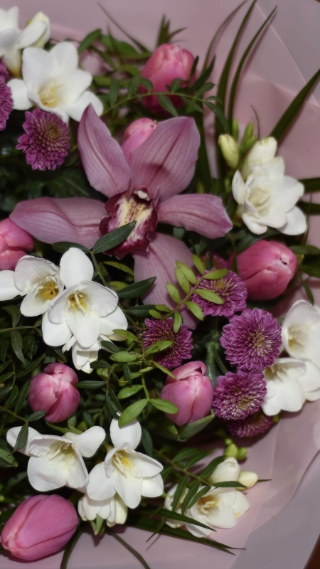 A beautiful handtied bouquet of pink tulips, santini, rose, scented white freesias complemented with green foliage
