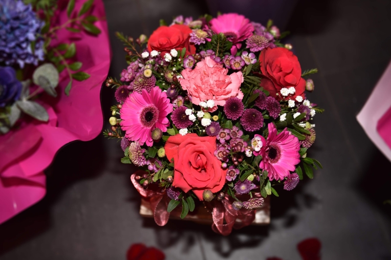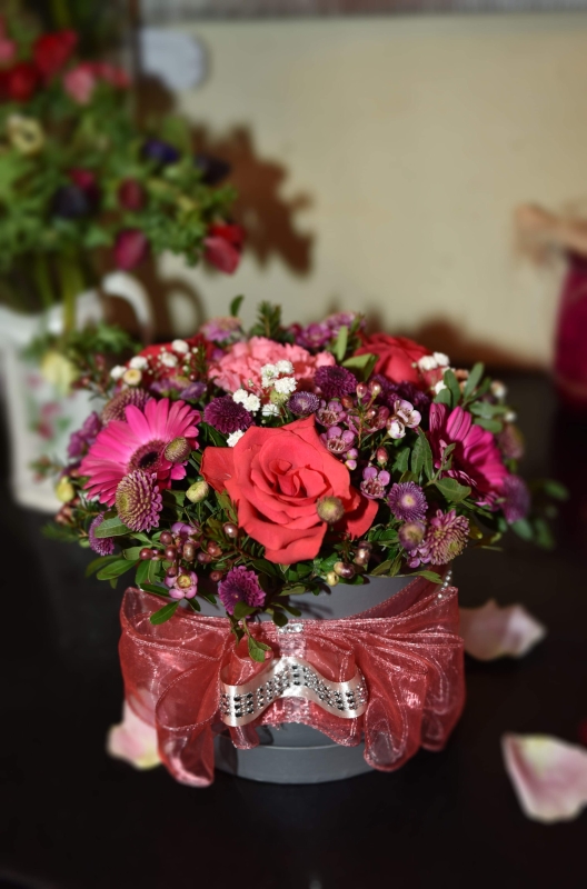 A beautiful mother's day flower arrangement in a luxury box with ribbon consisting of roses, gerberas, carnations, santini, gypsophila and different foliage